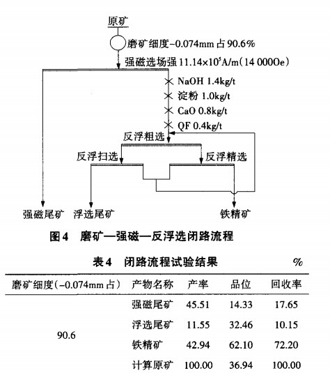 3.4、磨礦-強(qiáng)磁-反浮選閉路流程試驗(yàn)